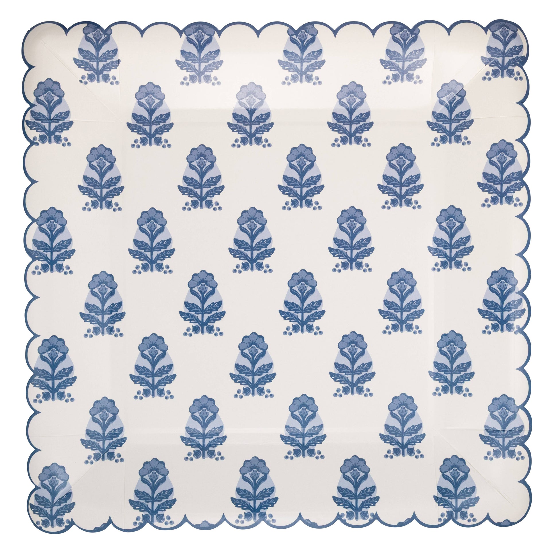 Bring springtime charm to your Easter celebration with this delightful 10" square plate featuring a cheerful light blue and cream flower block print design. Perfect for festive table settings, this charming piece adds a pop of botanical beauty to your holiday spread. • Light blue and cream flower pattern square plate • Scalloped edges • Includes 8 shaped paper plates • 10" x 10"