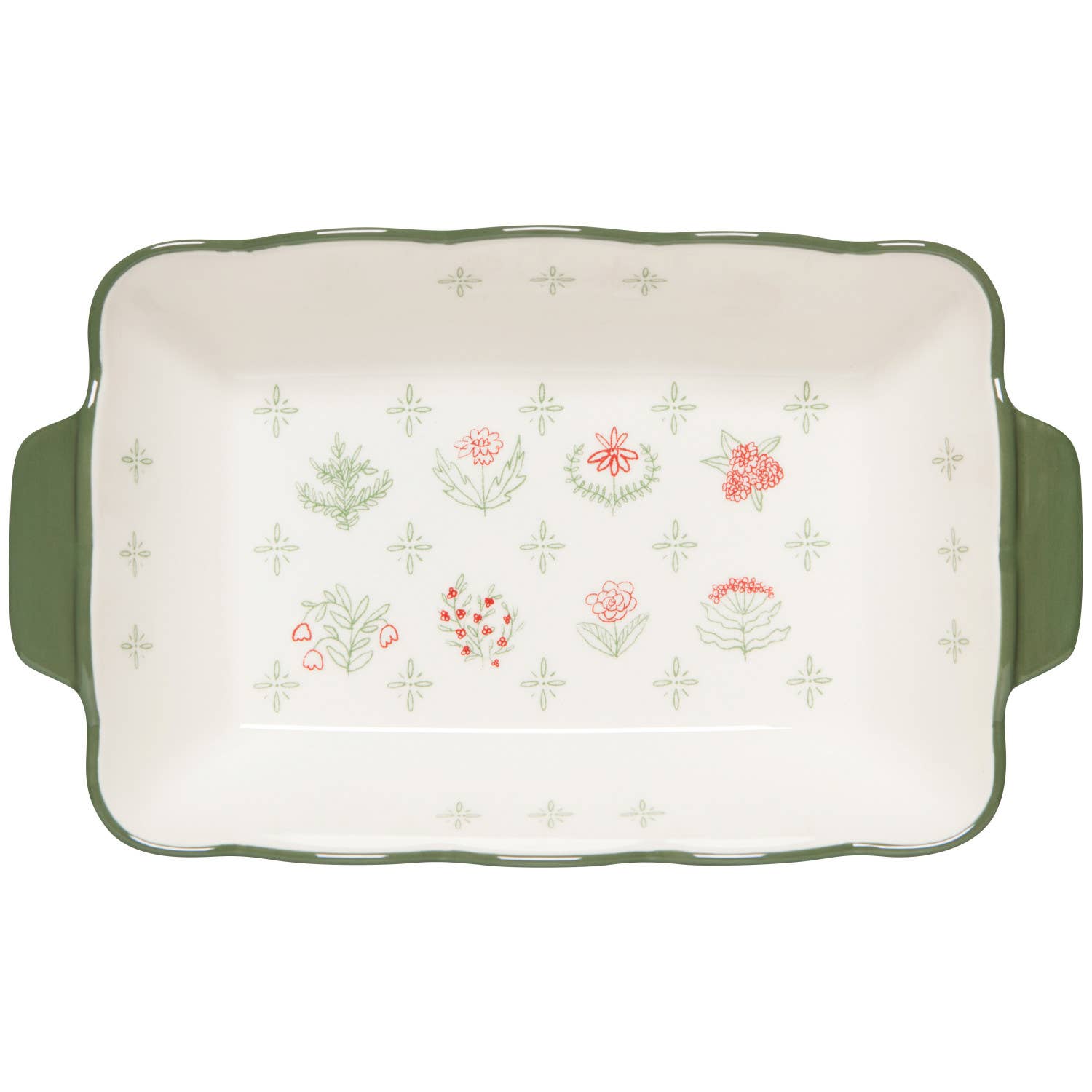 Delicate flowers in a quaint palette of sage green, wine red, and bright white exude rustic farmhouse charm with this essential cooking and baking dish.