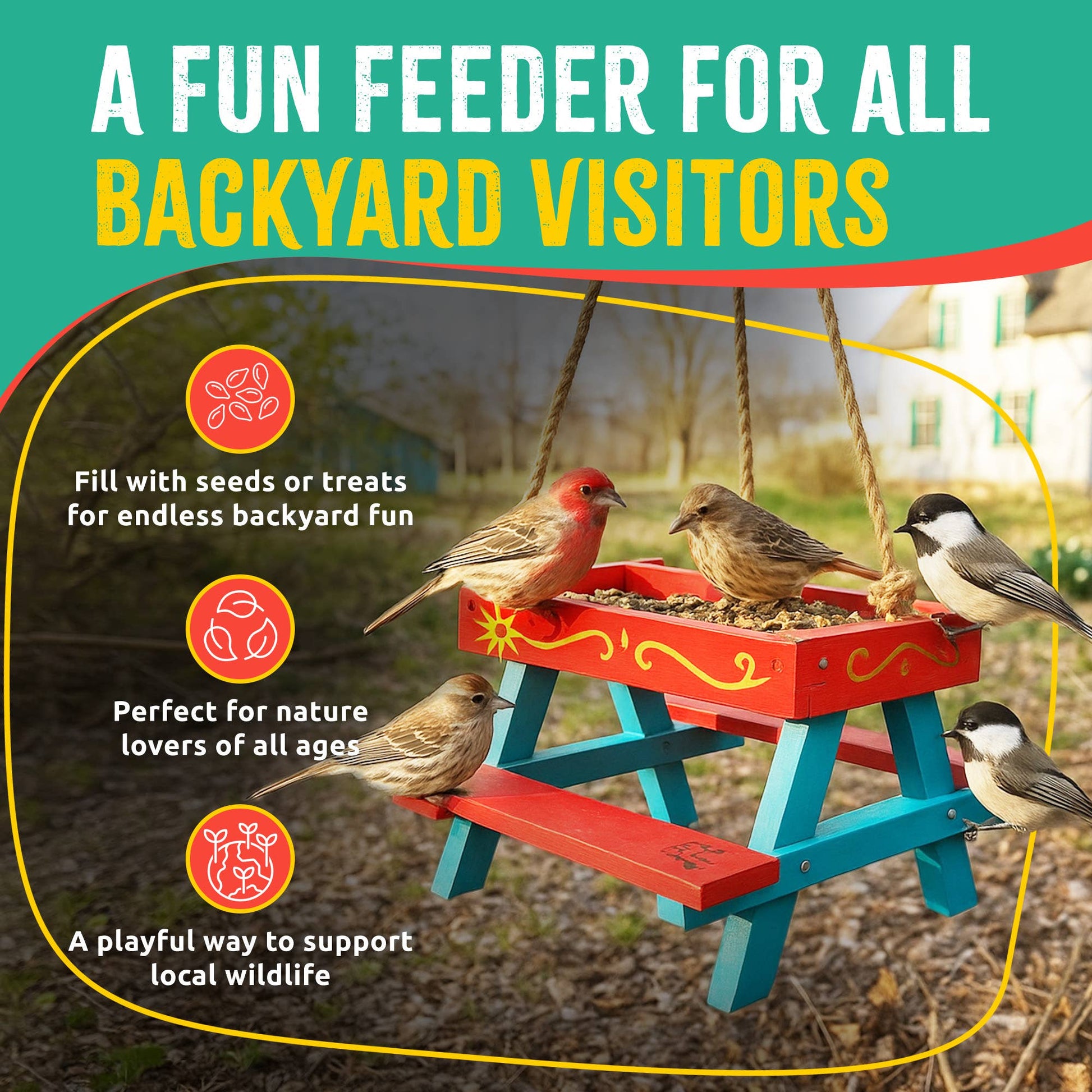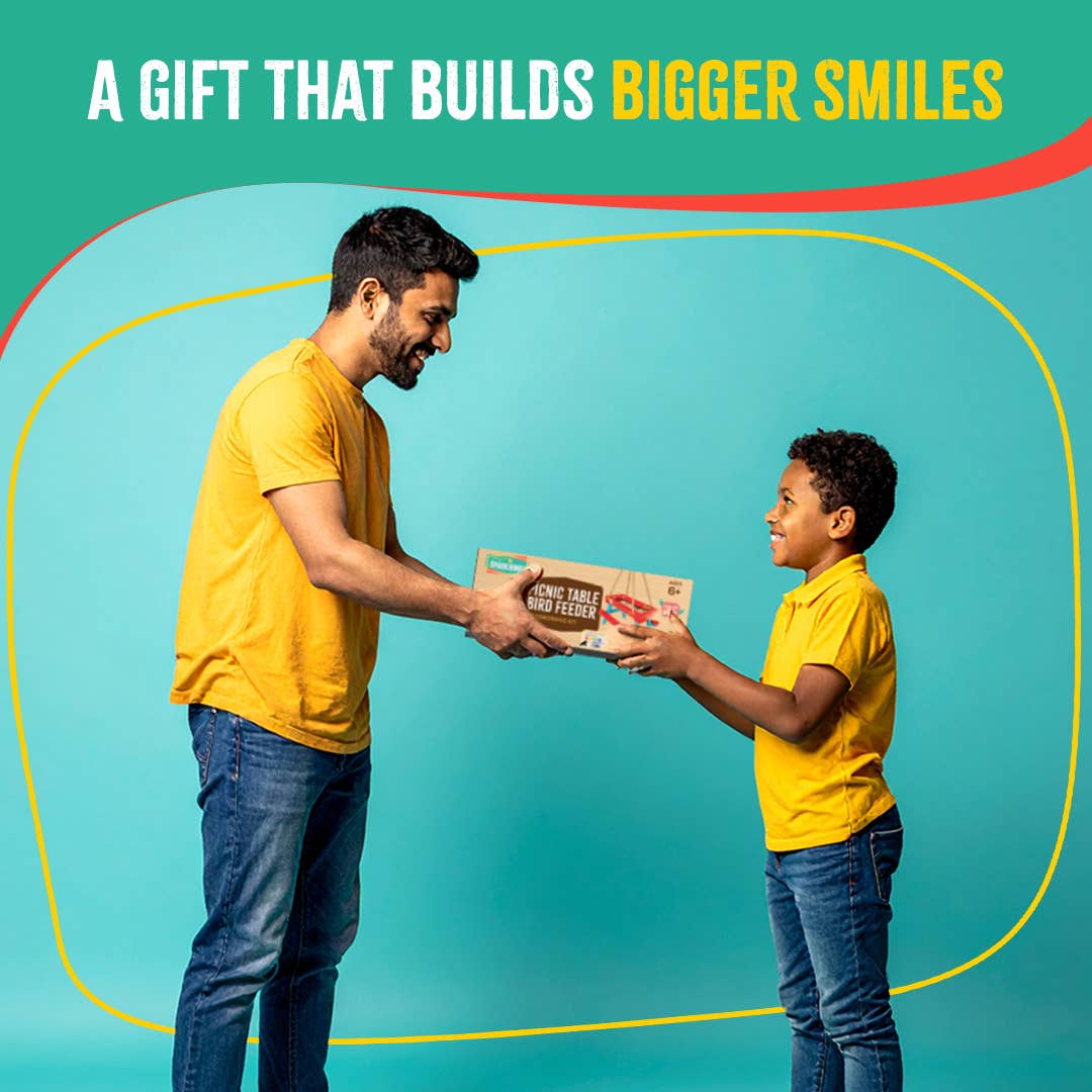 Our Picnic Table Feeder Kit includes sustainably sourced FSC New Zealand pine, a sturdy powder-coated metal mesh, hanging rope and ring, sandpaper, screws, and a child-safe tool—PLUS a cheerful 6‑color paint set! With guided steps, it's a creative treat for kids ages 6+ and a great way to get hands-on together. This hands-on project lights up creativity, builds fine motor skills, and introduces basic engineering—all wrapped in fun and engagement. It’s so much more than just a craft. Build it together and enjoy real connection, giggles, and learning side by side. Looking for a heartfelt gift? This kit is perfect for birthdays and holidays. Kids can build something special while creating a sweet little spot to welcome backyard birds and squirrels. Plus, it's a meaningful and creative experience they'll treasure.
